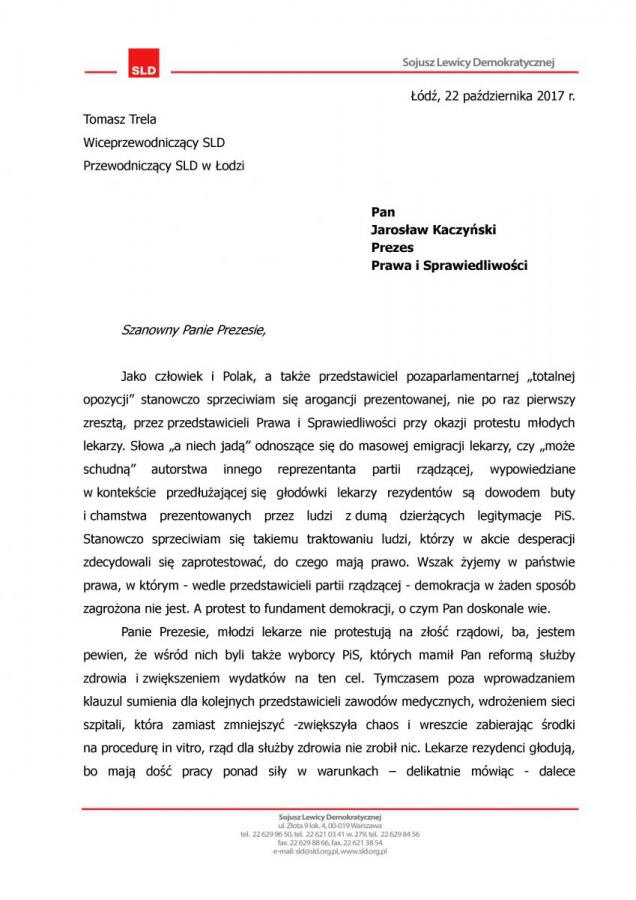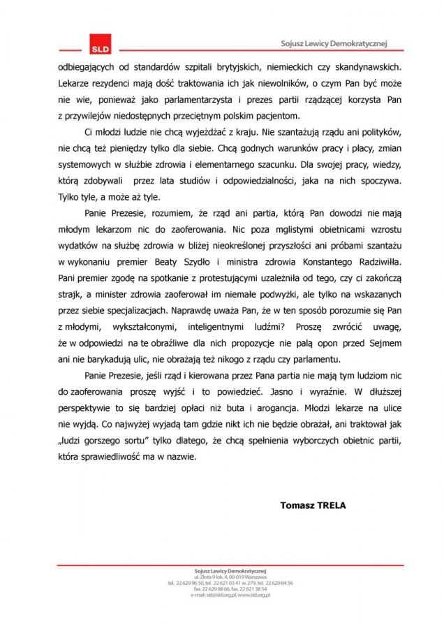List otwarty wiceprzewodniczącego SLD Tomasza Treli do Jarosława Kaczyńskiego prezesa Prawa i Sprawiedliwości w związku z protestem lekarzy rezydentów.