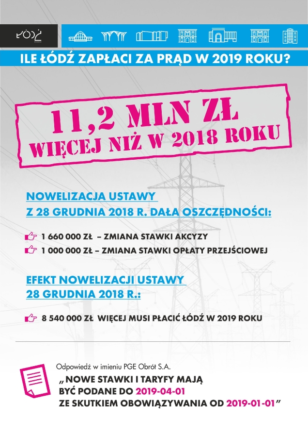 Według wyliczeń łódzkiego magistratu, pomimo obniżenia akcyzy i opłaty przejściowej Łódź będzie musiała zapłacić w 2019 roku aż o 8,5 mln zł więcej za prąd niż w roku ubiegłym. Państwowa spółka PGE Obrót, mimo apeli ze strony polityków PiS o renegocjacje umów na dostawę prądu, nie spieszy się z podjęciem rozmów.