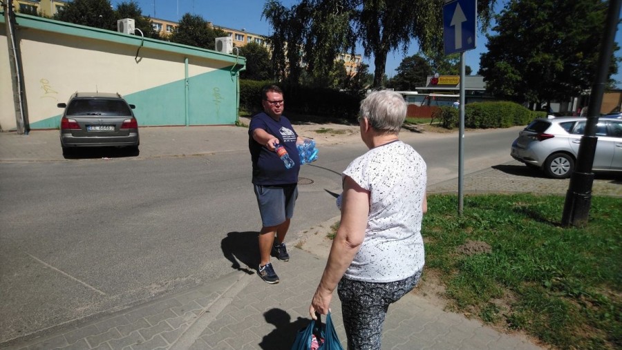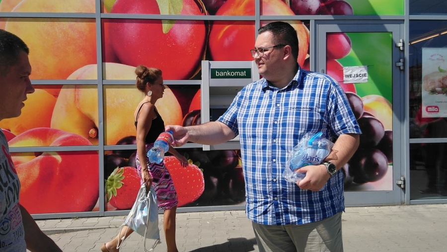 "Przypominamy mieszkańcom Zgierza, że upał może być niebezpieczny, dlatego trzeba pamiętać o kilku podstawowych zasadach, takich jak noszenie nakrycia głowy, możliwie jak najkrótsze przebywanie w pełnym słońcu i oczywiście picie dużej ilości napojów. Właśnie dlatego mamy dziś dla mieszkańców butelki wody, która pomoże przetrwać gorączki" - powiedział Łukasz Kubiak sekretarz SLD w powiecie zgierskim.